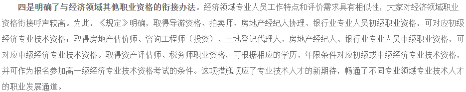 人社部专业技术人员管理司有关负责人就《经济专业技术资格规定》及《经济专业技术资格考试实施办法》答记者问,其中,提到了明确了与经济领域其他职业资格的衔接办法。截图如下: