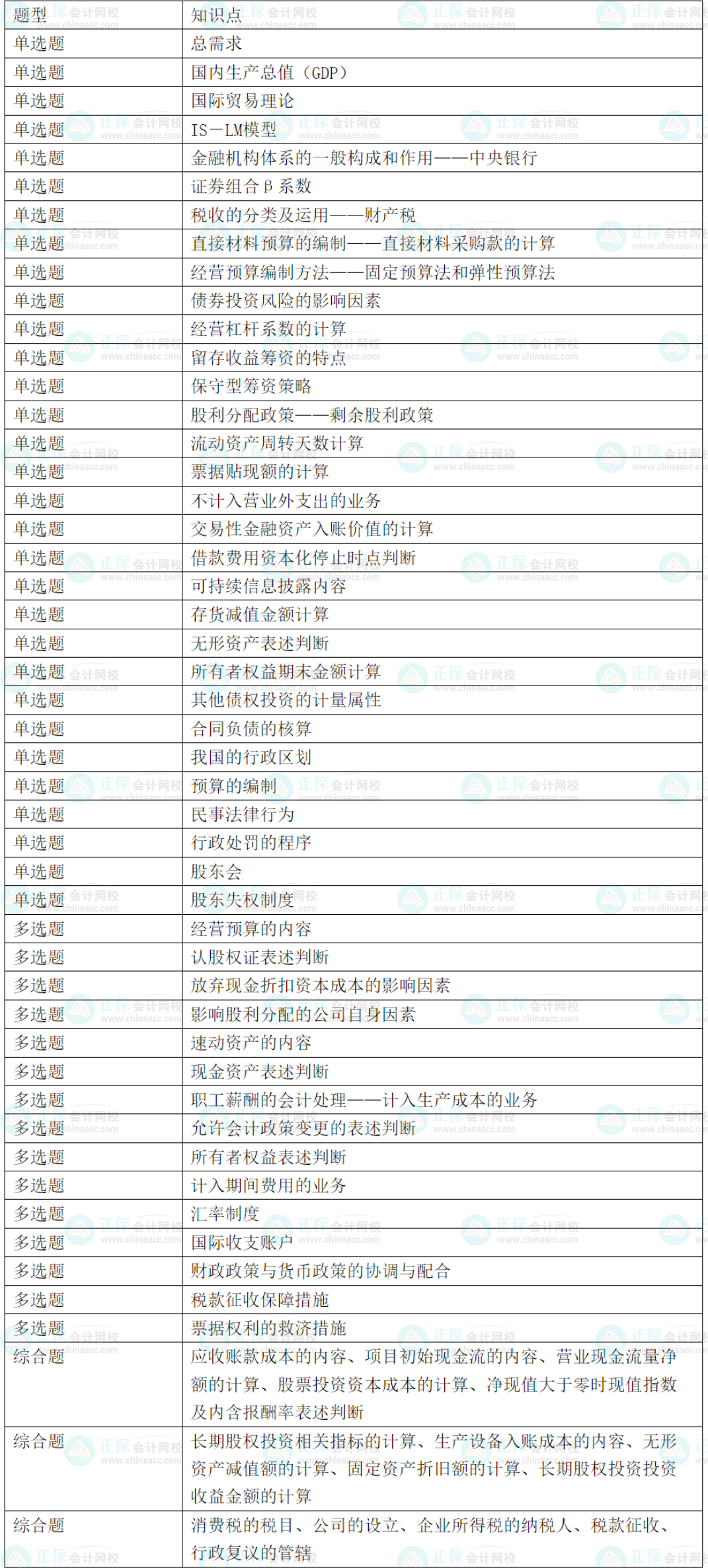 根据目前考生回忆的知识点(由于收集的考点信息有限,只收集到部分题目,仅供参考),各章考点及考查题型如下表所示: