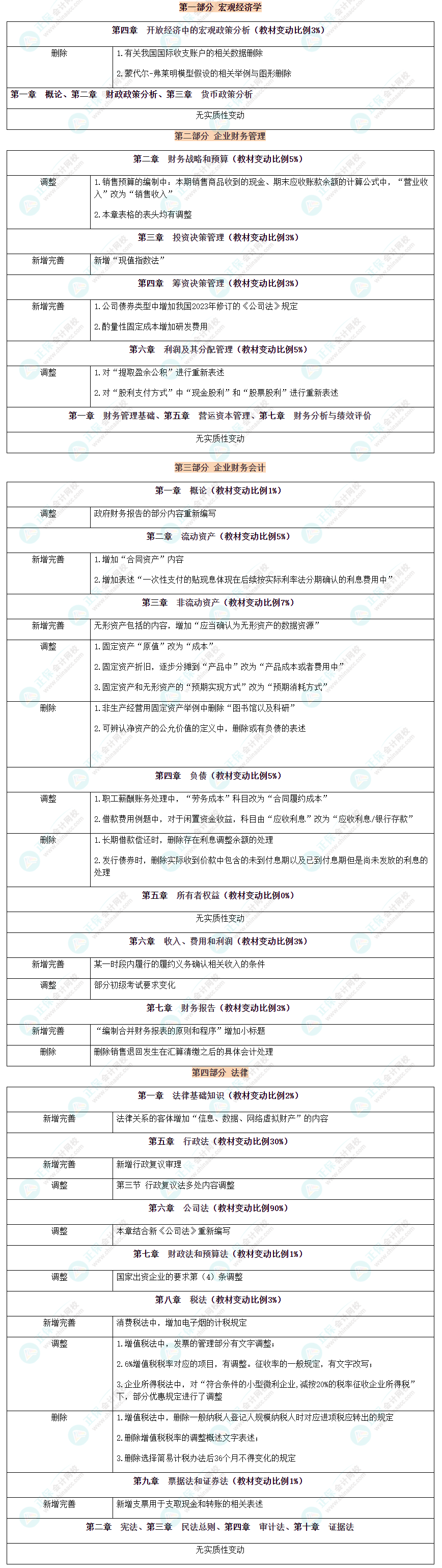 与2023年教材相比,2024年《审计相关基础知识》教材整体框架未发生变动,整体变动不大,仅是个别章节变动较大,主要是第四部分第五章行政法、第六章公司法。其余章节变动较小,主要是一些细节性的扩充和表述调整。
