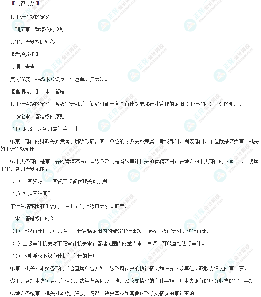以下是2024初级审计师《审计相关基础知识》高频考点:审计管辖