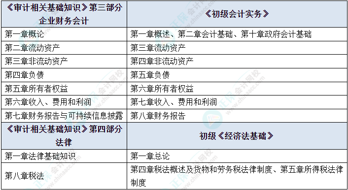 审计师包括两个科目:《审计理论与实务》和《审计相关基础知识》。其中,《审计理论与实务》与初级会计师几乎没有交叉重叠的知识;《审计相关基础知识》与初级会计实务有约30%的内容是相似的,尤其是企业财务会计部分与初级会计师实务相似度较高,相似的内容如下表所示: