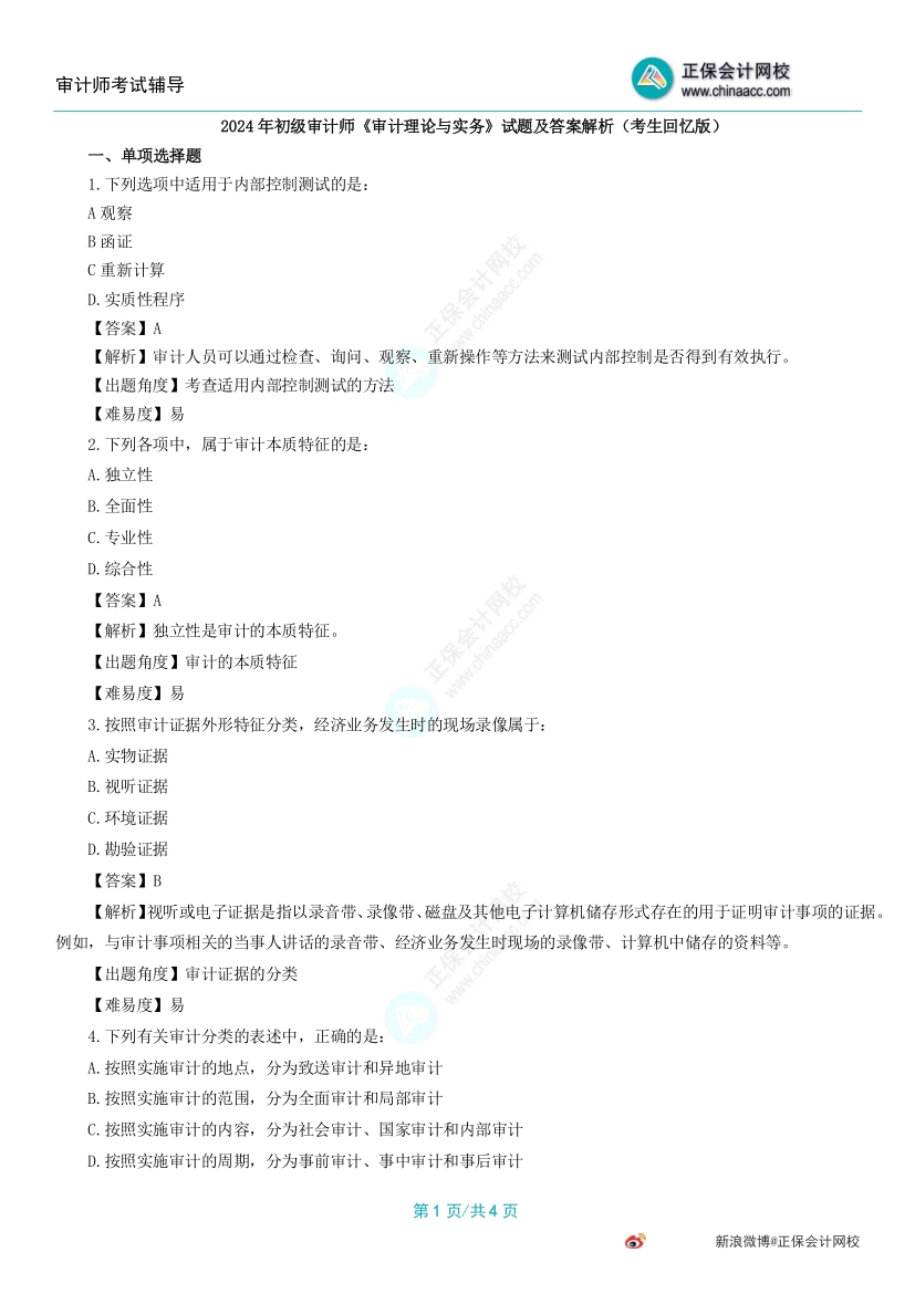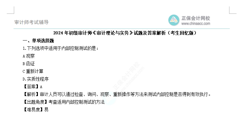 2024年初级审计师考试《审计理论与实务》科目顺利落下帷幕,想必同学们在经过一年甚至更多时间备考之后,考场上发挥超常吧?正保会计网校特整理的2024年审计师考试试题及参考答案,本文为《审计理论与实务》考生回忆版试卷,大家可以利用参考、预估考试成绩哦~