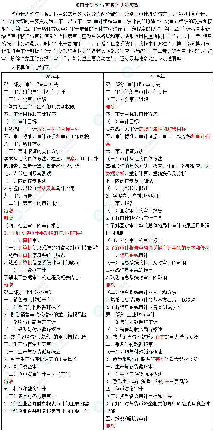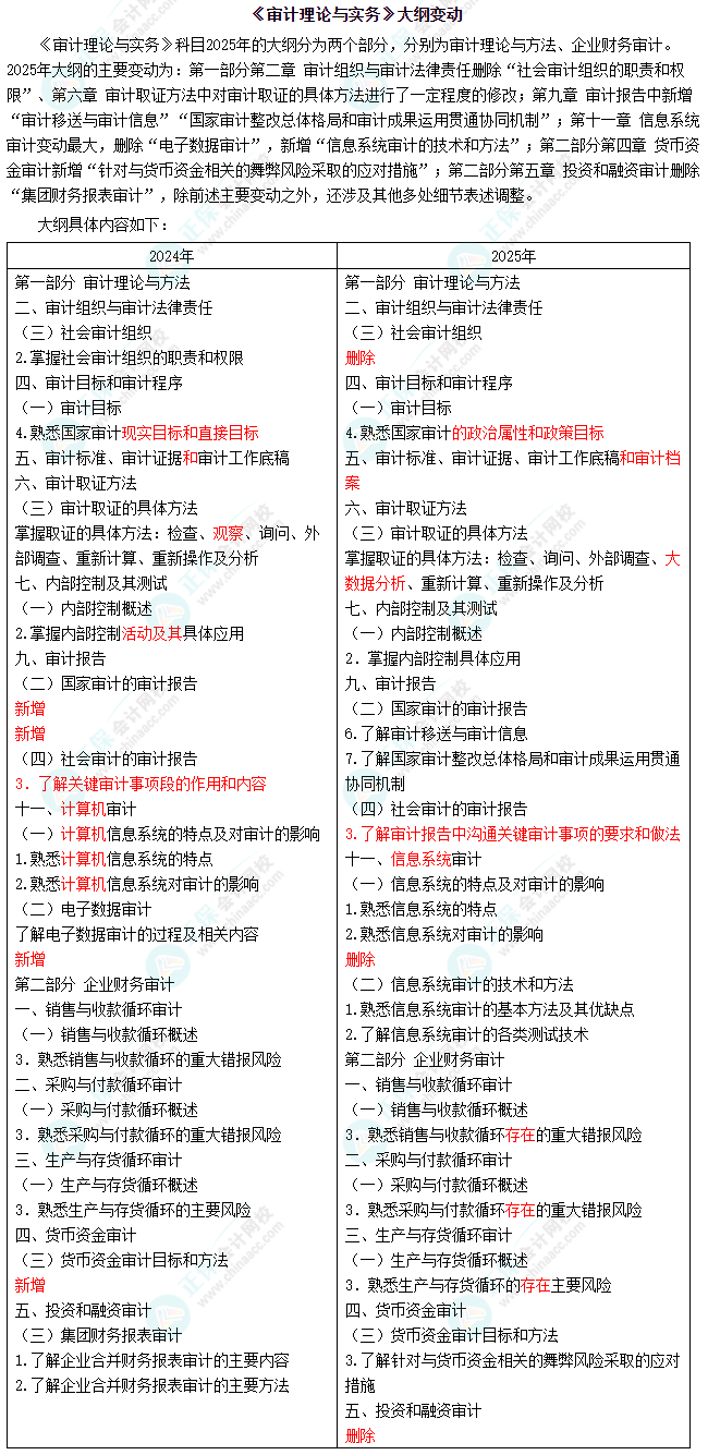 2025年初级审计师考试大纲已公布(点击查看大纲>)!2025年初级《审计理论与实务》与2024年考试大纲变化大吗?正保会计网校针对新旧考试大纲的变化进行了对比分析,让你轻松看懂变化。