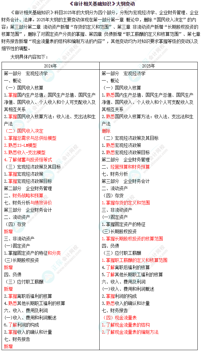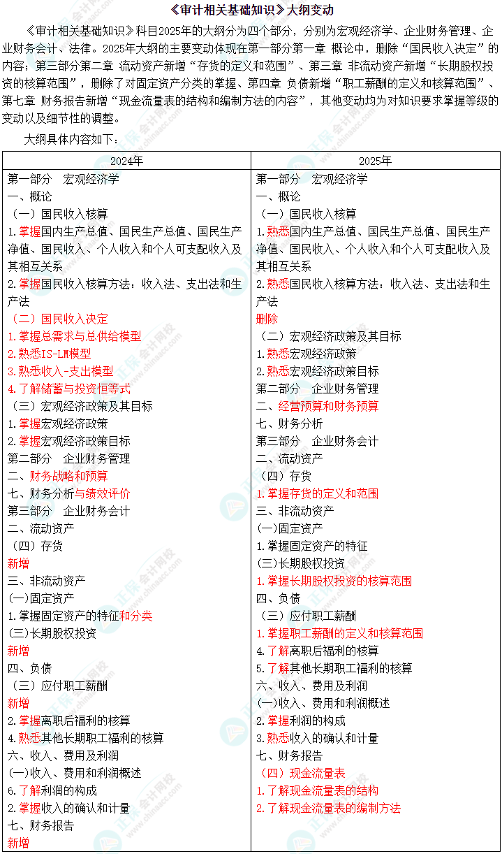 2025年初级审计师考试大纲已公布(点击查看大纲>)!2025年初级《审计相关基础知识》与2024年考试大纲变化大吗?正保会计网校针对新旧考试大纲的变化进行了对比分析,让你轻松看懂变化。