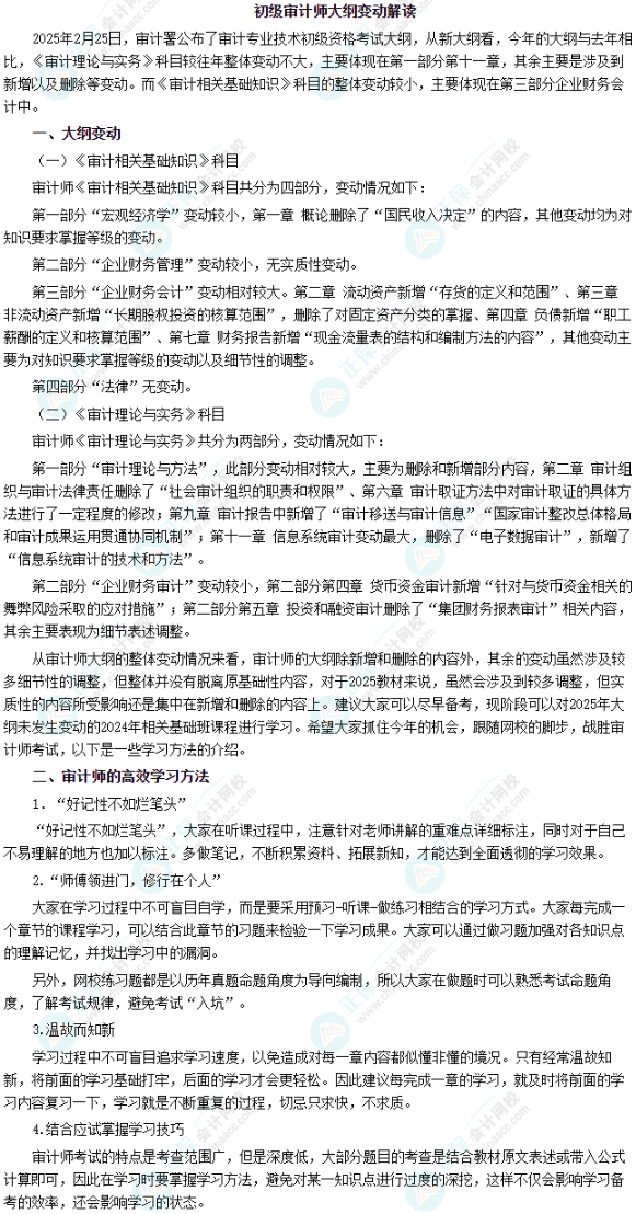 2025年初级审计师考试大纲已经公布,有哪些变化呢?变化大不大?接下来要怎么学?不少学员都有疑问,接下来让我们一起看看吧!