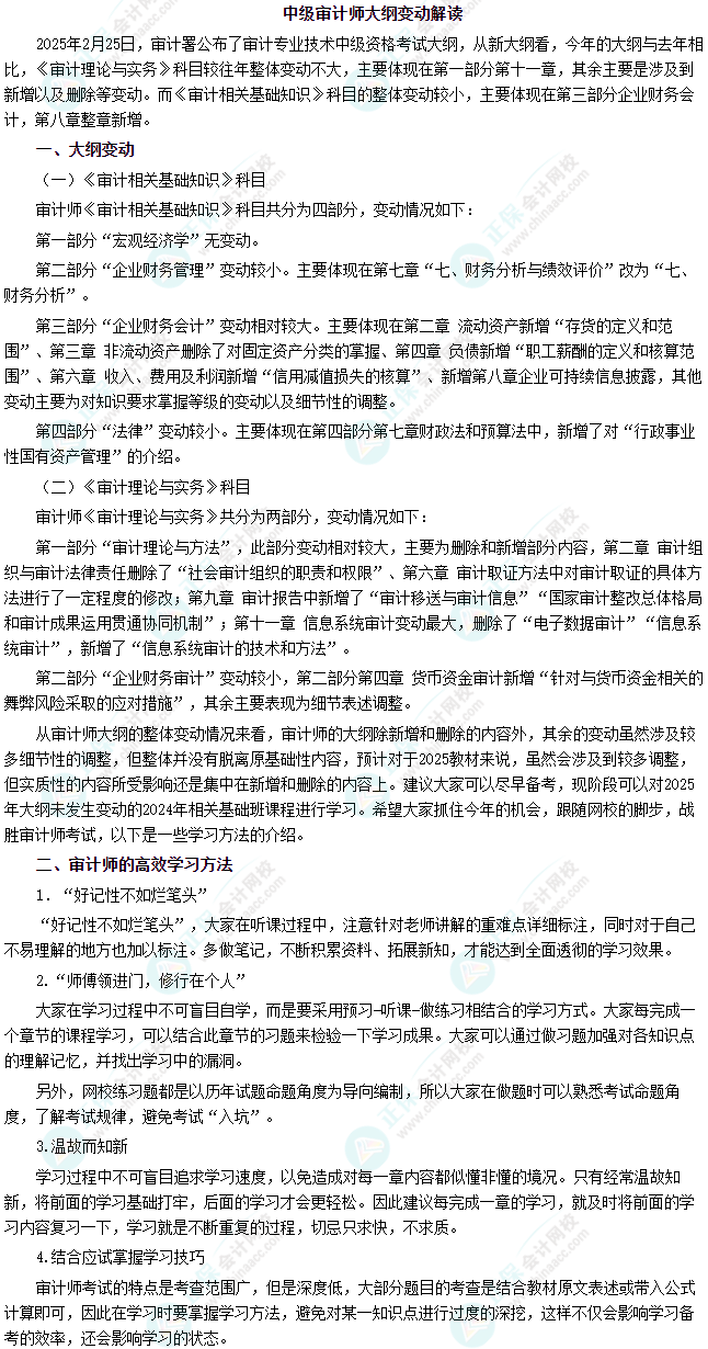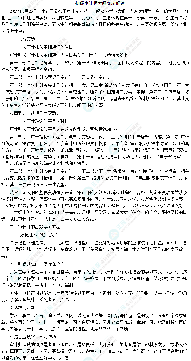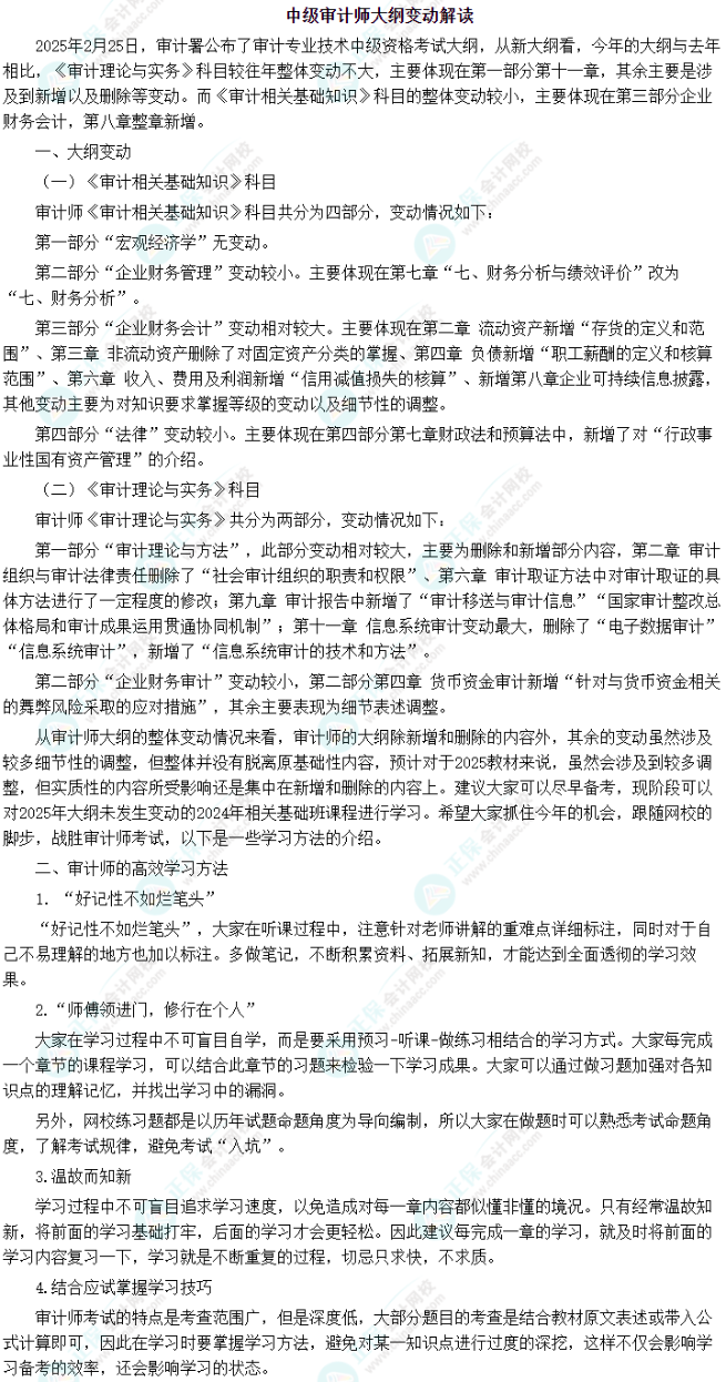 2025年中级审计师考试大纲已经公布,有哪些变化呢?变化大不大?接下来要怎么学?不少学员都有疑问,接下来让我们一起看看吧!