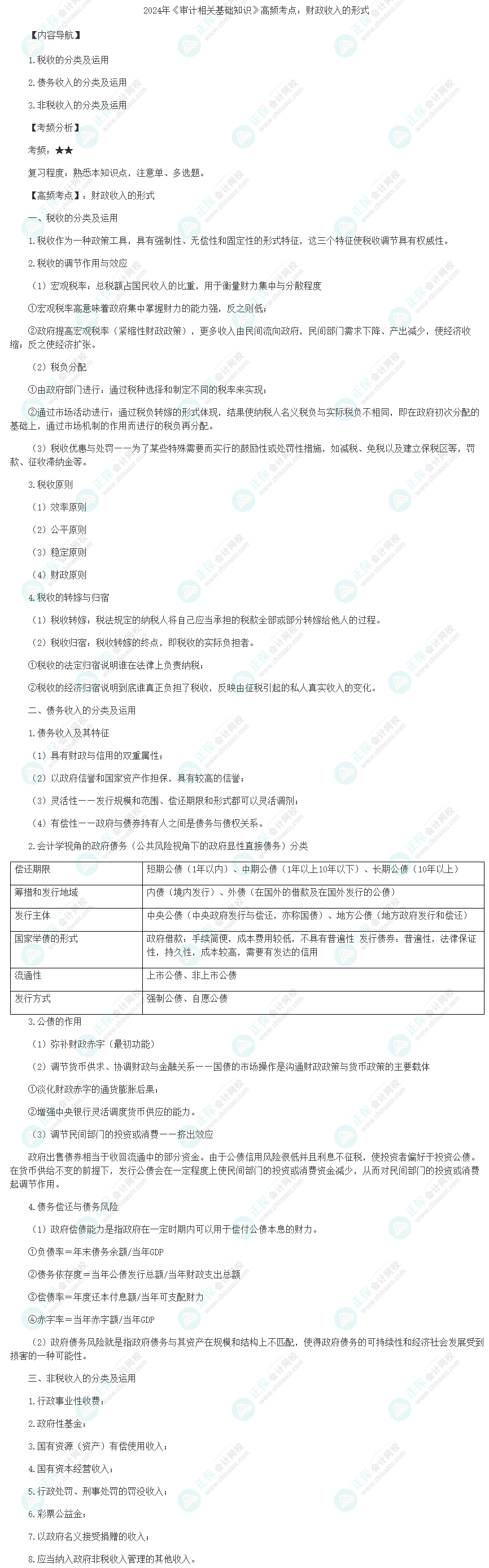 以下是2024中级审计师《审计相关基础知识》高频考点:财政收入的形式