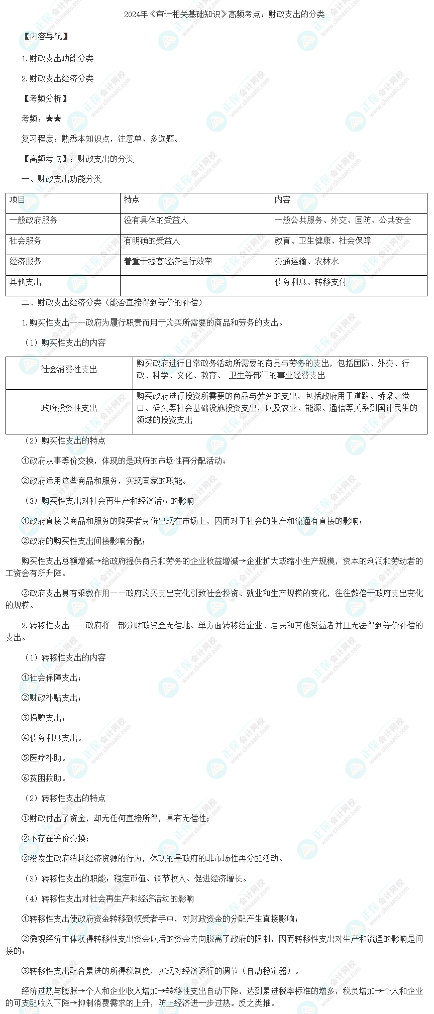 以下是2024中级审计师《审计相关基础知识》高频考点:财政支出的分类