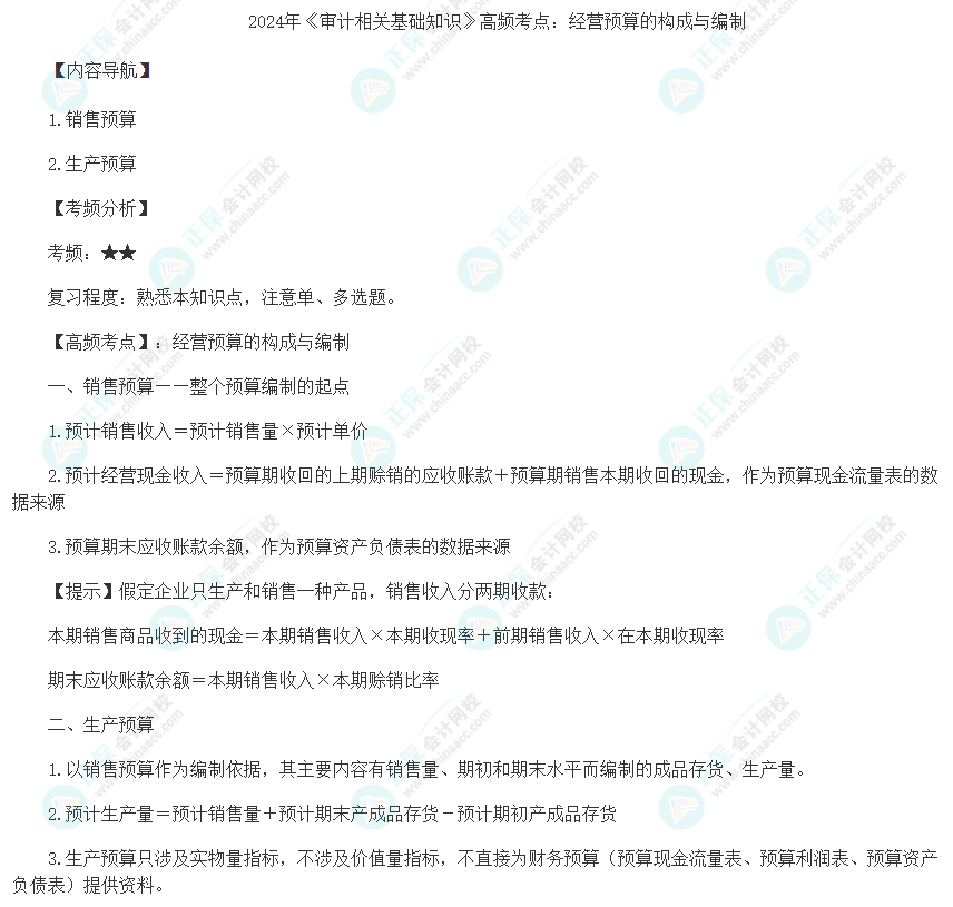以下是2024中级审计师《审计相关基础知识》高频考点:经营预算的构成与编制