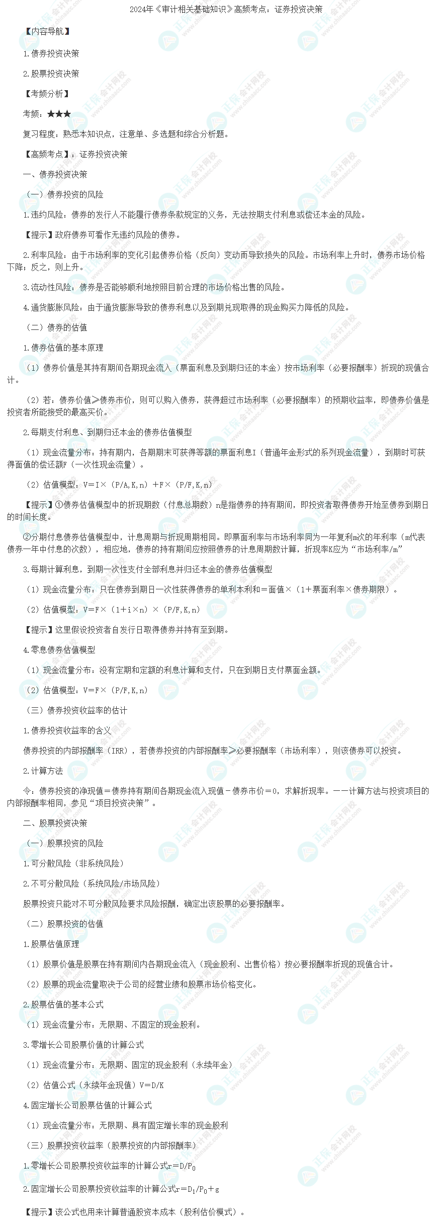 以下是2024中级审计师《审计相关基础知识》高频考点:证券投资决策