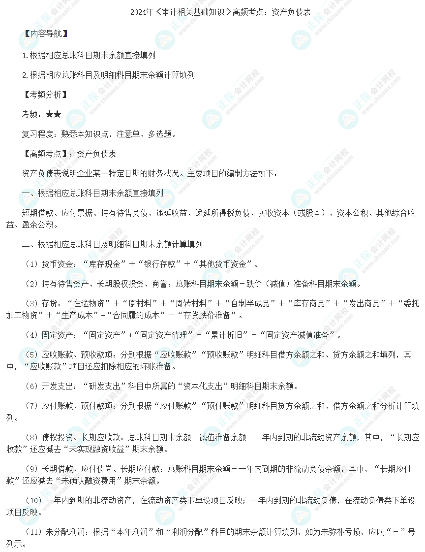 以下是2024中级审计师《审计相关基础知识》高频考点:资产负债表