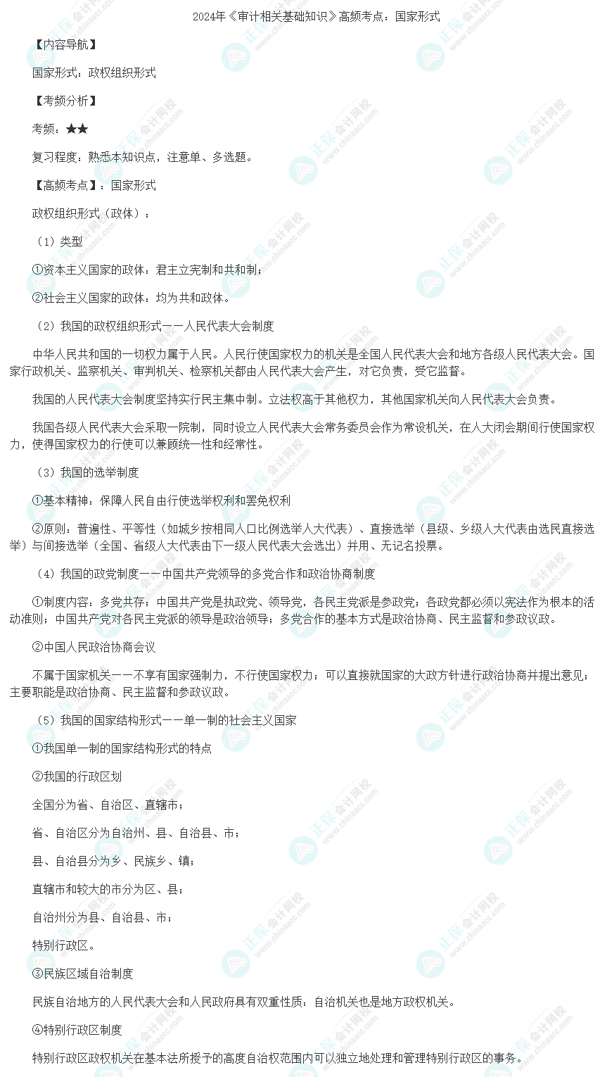 以下是2024中级审计师《审计相关基础知识》高频考点:国家形式
