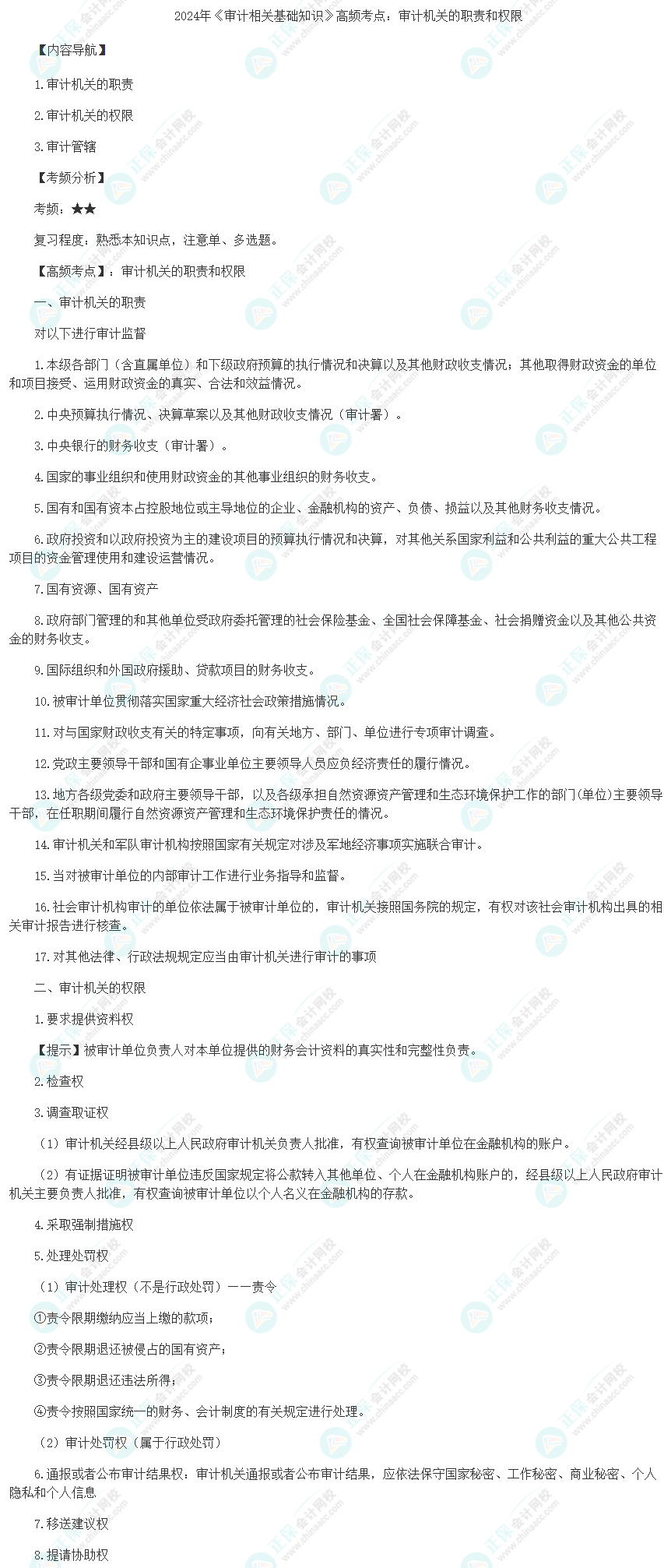 以下是2024中级审计师《审计相关基础知识》高频考点:审计机关的职责和权限