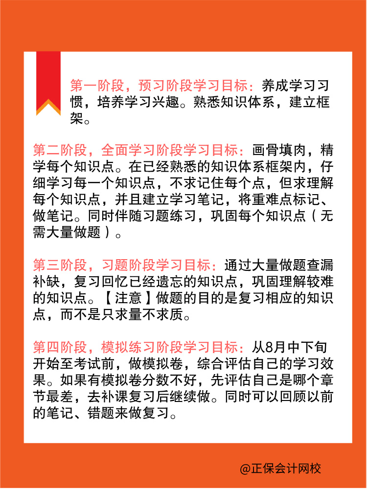 第四阶段,模拟练习阶段学习目标:从8月中下旬开始至考试前,做模拟卷,综合评估自己的学习效果。如果有模拟卷分数不好,先评估自己是哪个章节最差,去补课复习后继续做。同时可以回顾以前的笔记、错题来做复习。