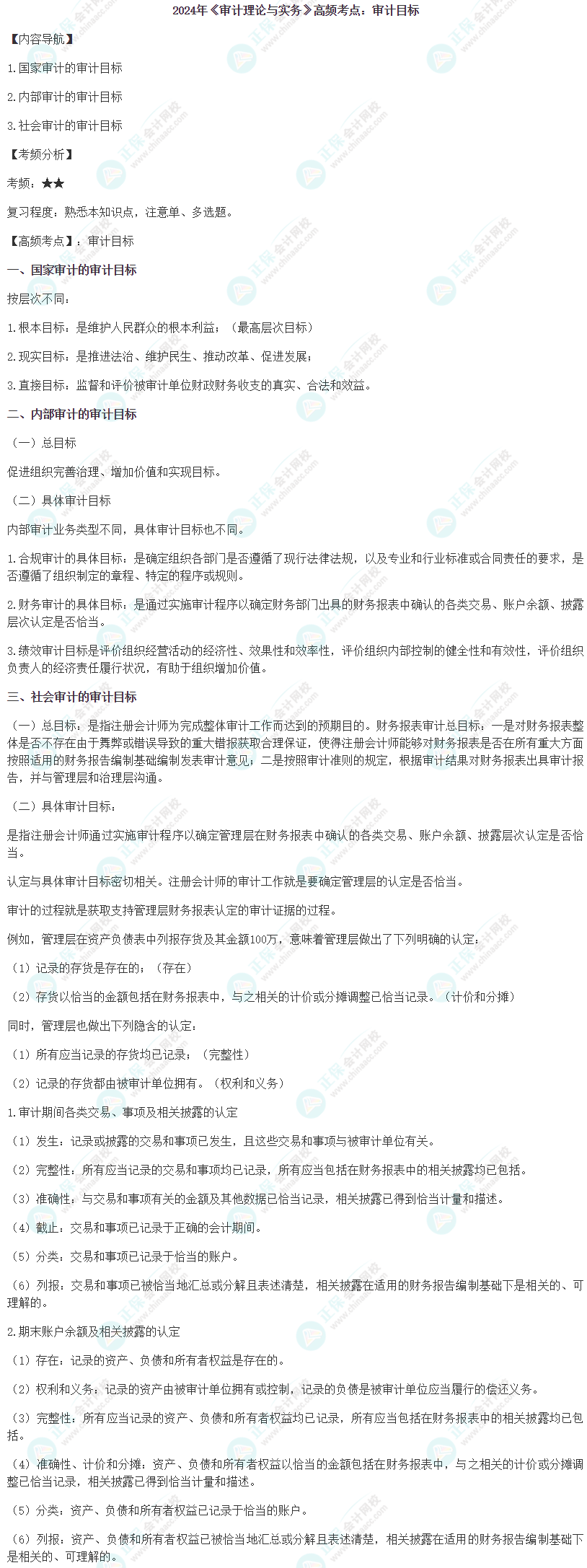 以下是2024中级审计师《审计理论与实务》高频考点:审计目标