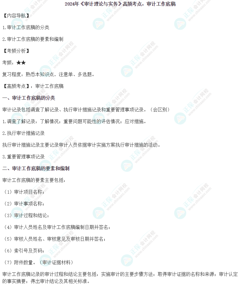 以下是2024中级审计师《审计理论与实务》高频考点:审计工作底稿