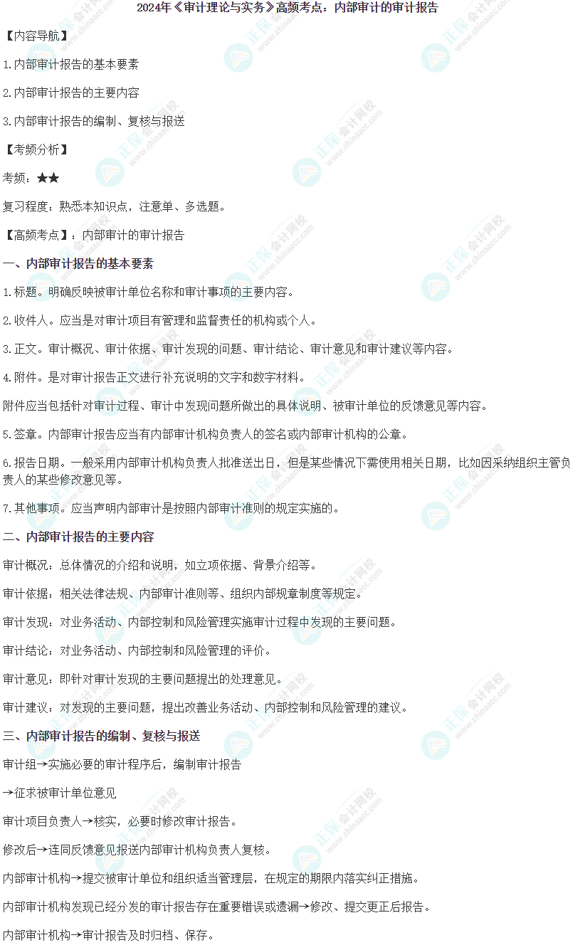 以下是2024中级审计师《审计理论与实务》高频考点:内部审计的审计报告