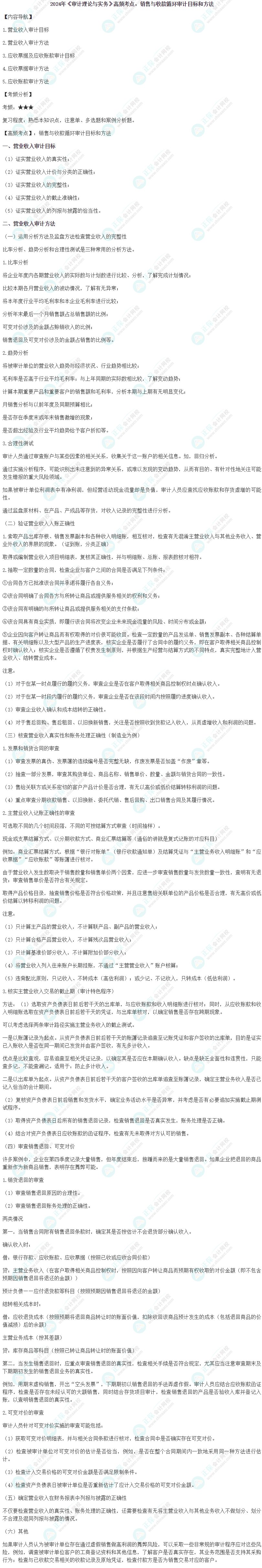 以下是2024中级审计师《审计理论与实务》高频考点:销售与收款循环审计目标和方法