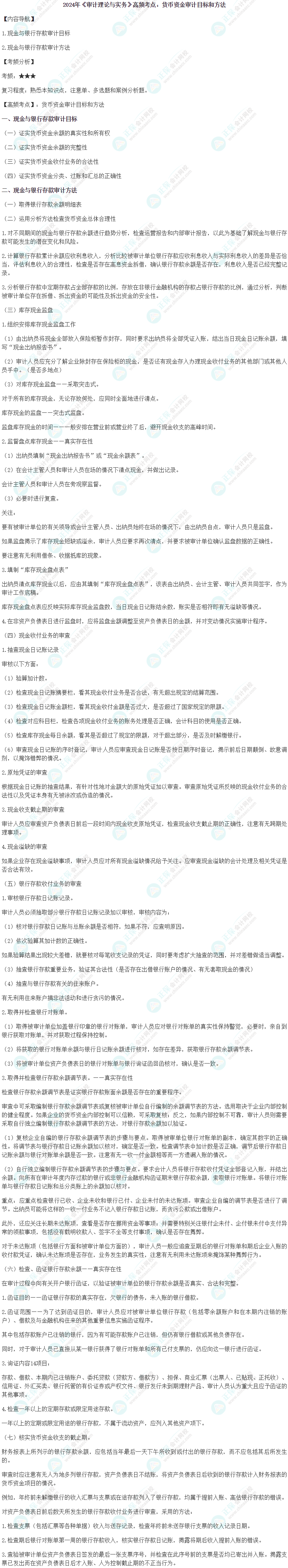 以下是2024中级审计师《审计理论与实务》高频考点:货币资金审计目标和方法