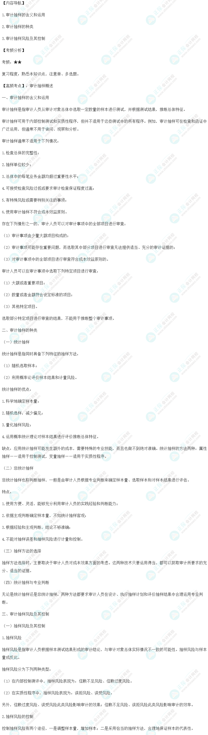2023年审计师考试9月24日开考,现在正是紧张的备考阶段,各位考生应了解考试考点,提高复习效率!正保会计网校为各位备战中级审计师考试的考生带来了《审计理论与实务》高频考点,跟上老师的步伐按计划完成学习,马上开始学习今天的《审计理论和实务》高频考点:审计抽样概述。