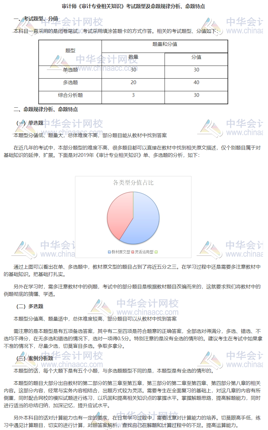 距离2020年审计师考试时间只有不到60天的时间了,大部分考生进行到了习题强化阶段中期。但有些考生不太了解审计师考试题型,网校老师为各位学员整理了2020年《审计专业相关知识》考试题型及命题规律分析、命题特点信息,一起来看看吧!