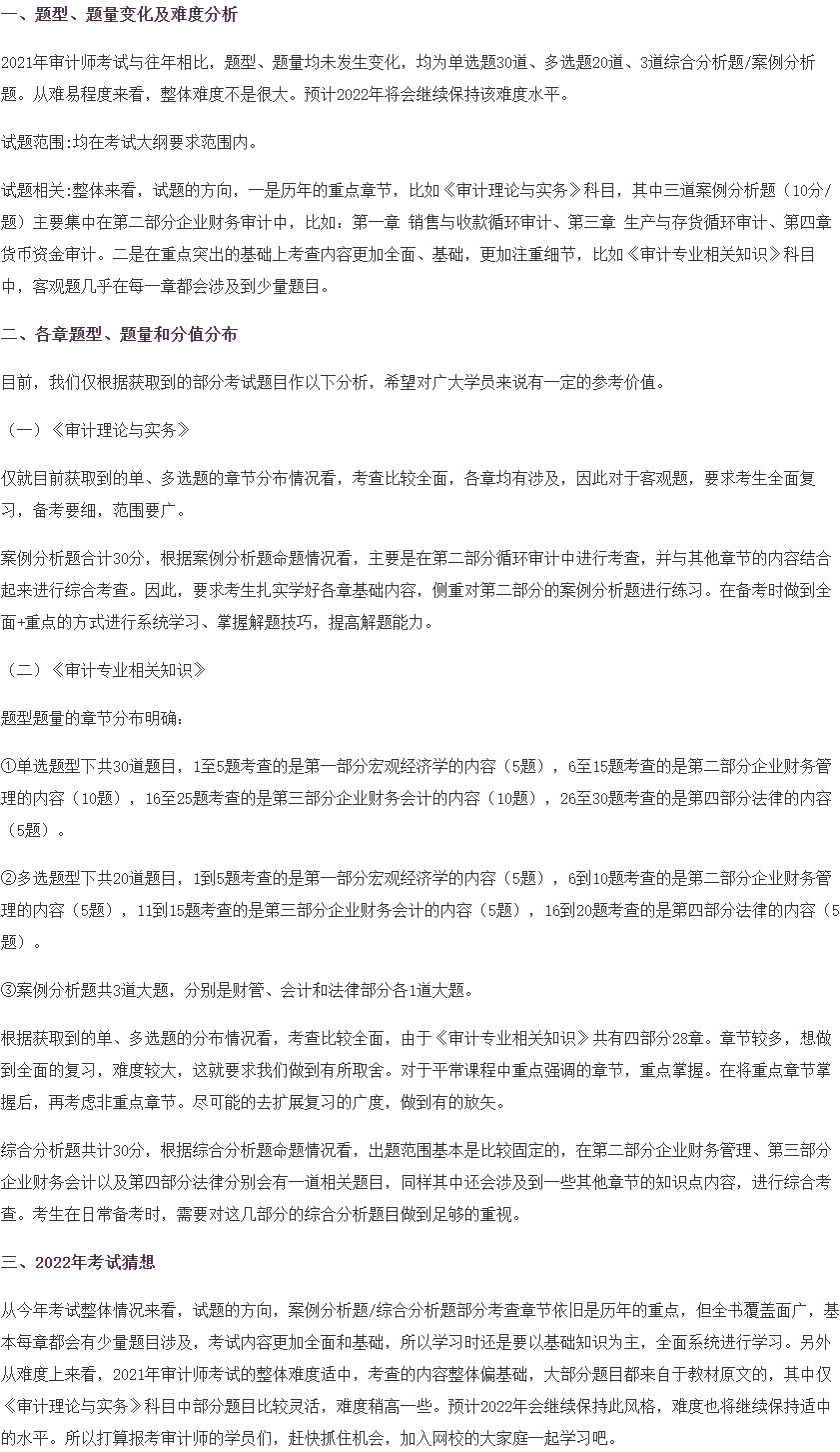 2021年审计师考试已经于10月10日结束啦,为了让广大学员朋友能够对考试情况有一个大概的了解,网校撰写了2021年审计师考后点评,对考情进行了细致分析。