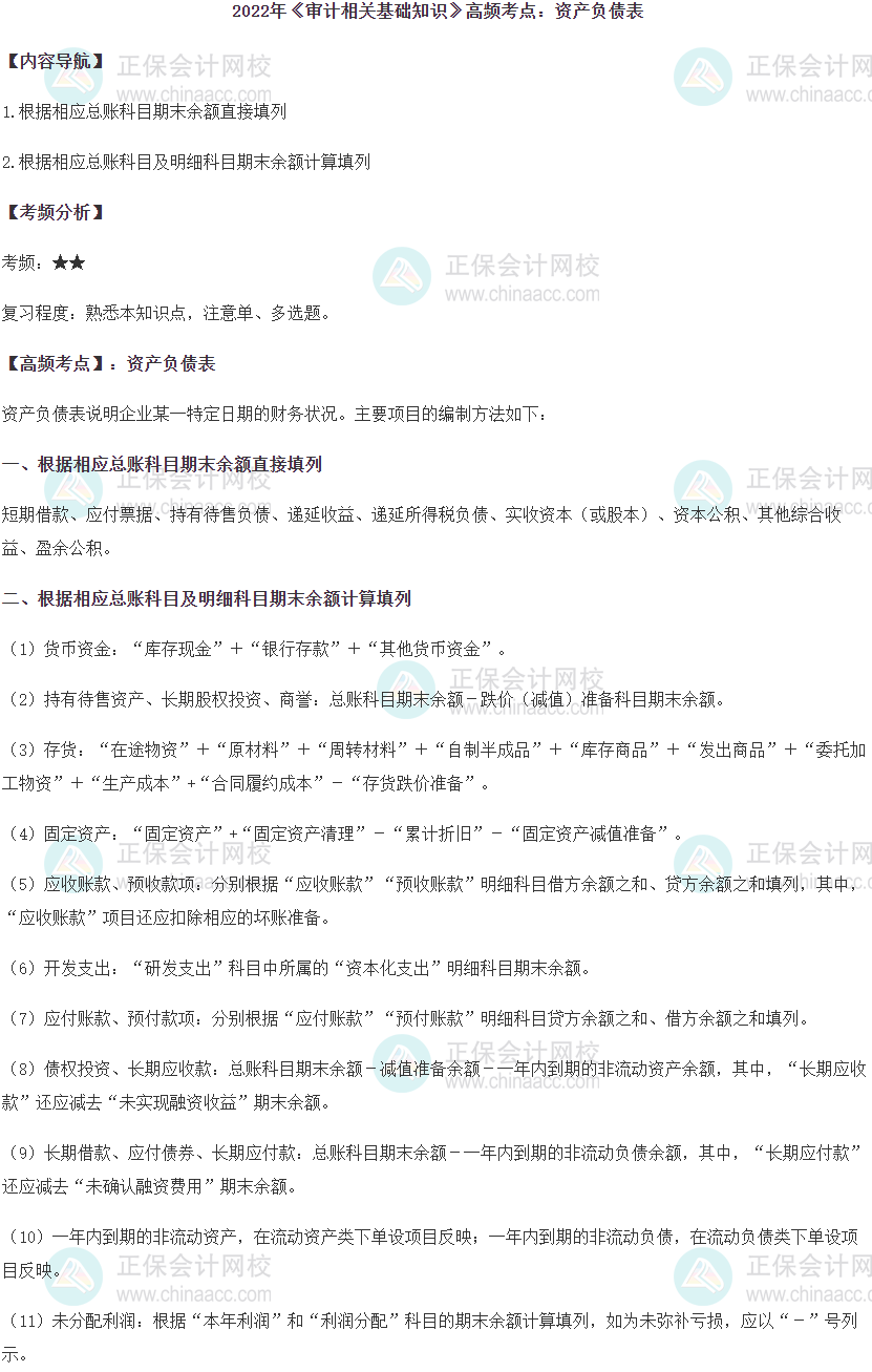2022中级《审计相关基础知识》高频考点:资产负债表