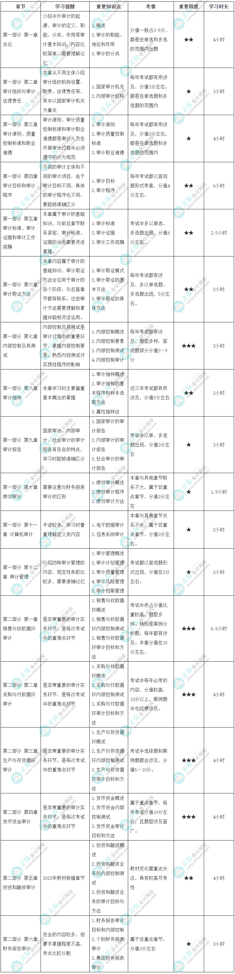 以下是网校整理的2023年中级《审计理论与实务》各章节学习提醒、重要知识点、考情、重要程度、学习时长,供各位考生参考: