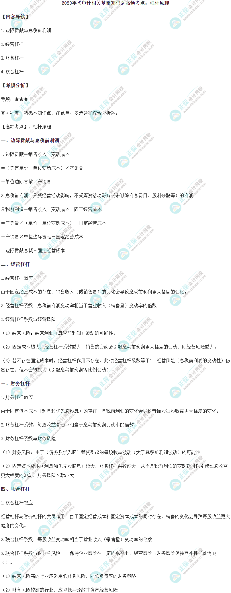 2023审计师备考内容多,学习一段时间注意总结,正保会计网校老师给大家整理了2023年审计师考试高频考点,下面是2023年中级《审计相关基础知识》高频考点:杠杆原理,赶紧看看,查漏补缺。