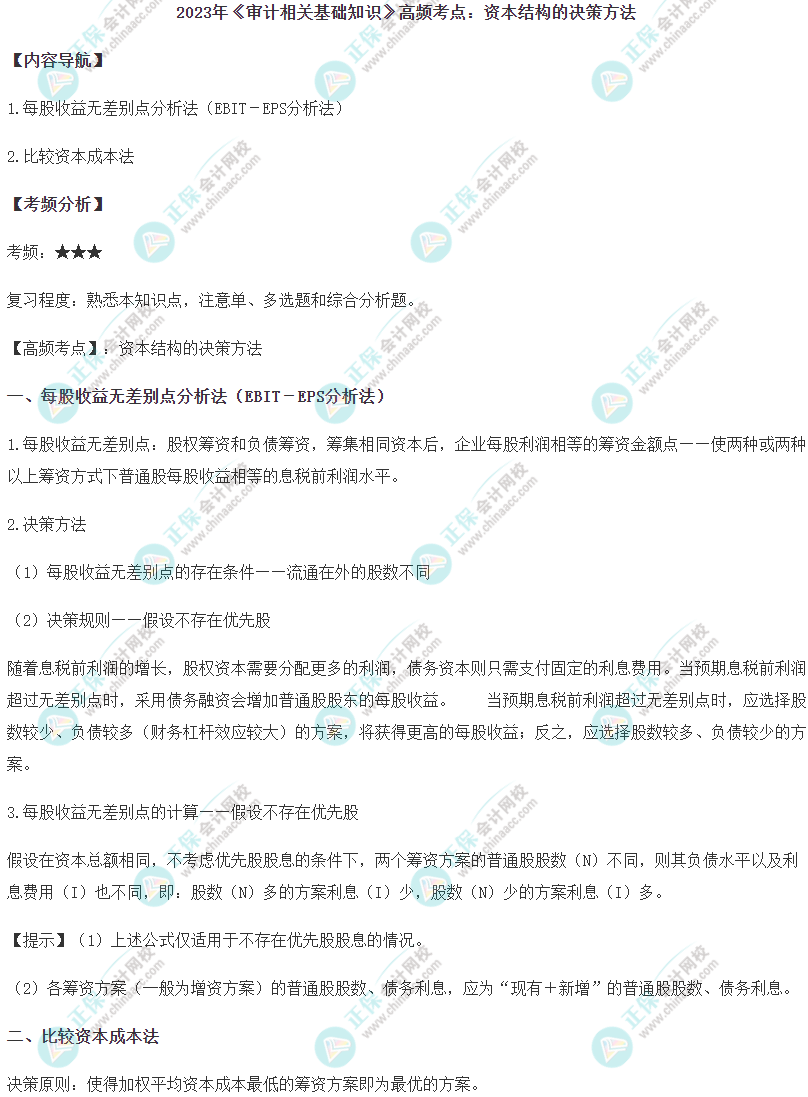 中级《审计相关基础知识》哪些知识点经常被考到呢?关注高频考点!下面是2023年中级《审计相关基础知识》高频考点:资本结构的决策方法,你掌握了没?快复习一下吧。