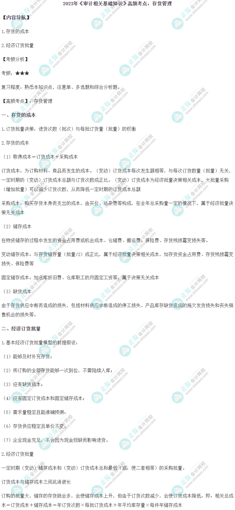 2023审计师备考内容多,学习一段时间注意总结,正保会计网校老师给大家整理了2023年审计师考试高频考点,下面是2023年中级《审计相关基础知识》高频考点:存货管理,赶紧看看,查漏补缺。