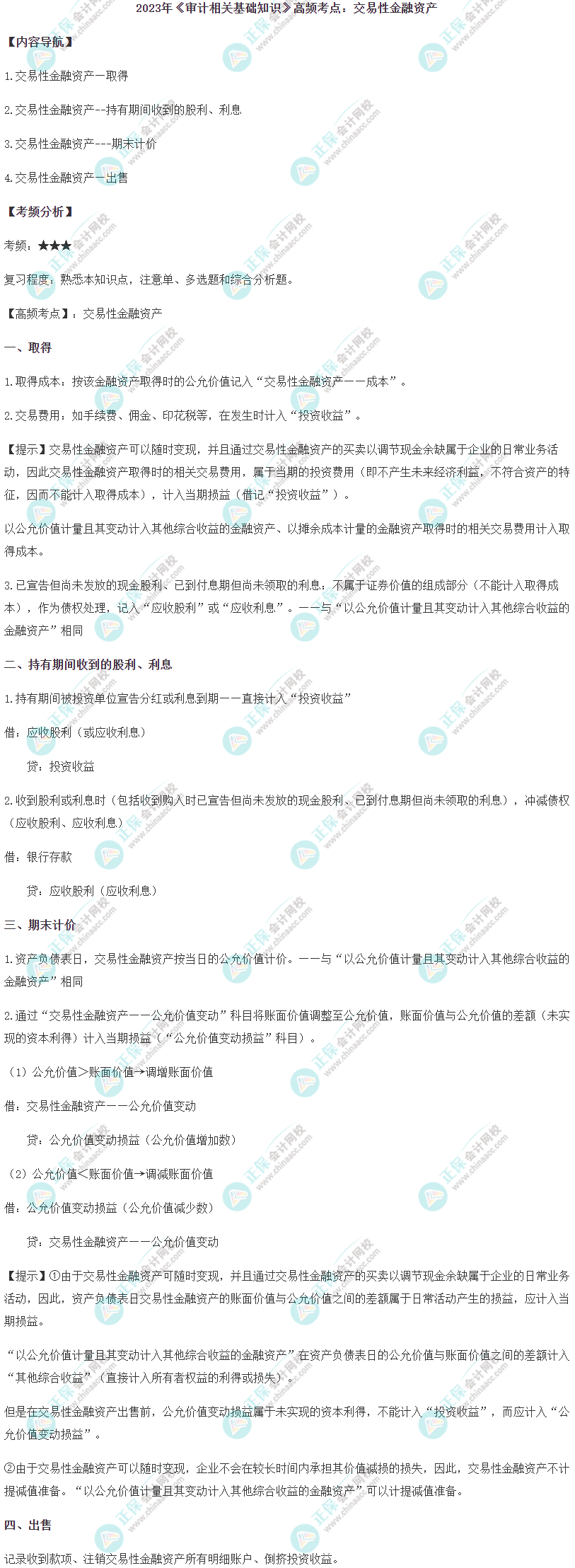 2023审计师备考内容多,学习一段时间注意总结,正保会计网校老师给大家整理了2023年审计师考试高频考点,下面是2023年中级《审计相关基础知识》高频考点:交易性金融资产,赶紧看看,查漏补缺。