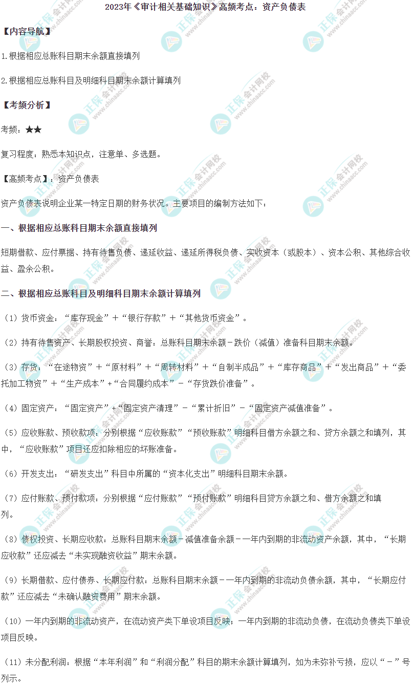 2023审计师备考内容多,学习一段时间注意总结,正保会计网校老师给大家整理了2023年审计师考试高频考点,下面是2023年中级《审计相关基础知识》高频考点:资产负债表,赶紧看看,查漏补缺。