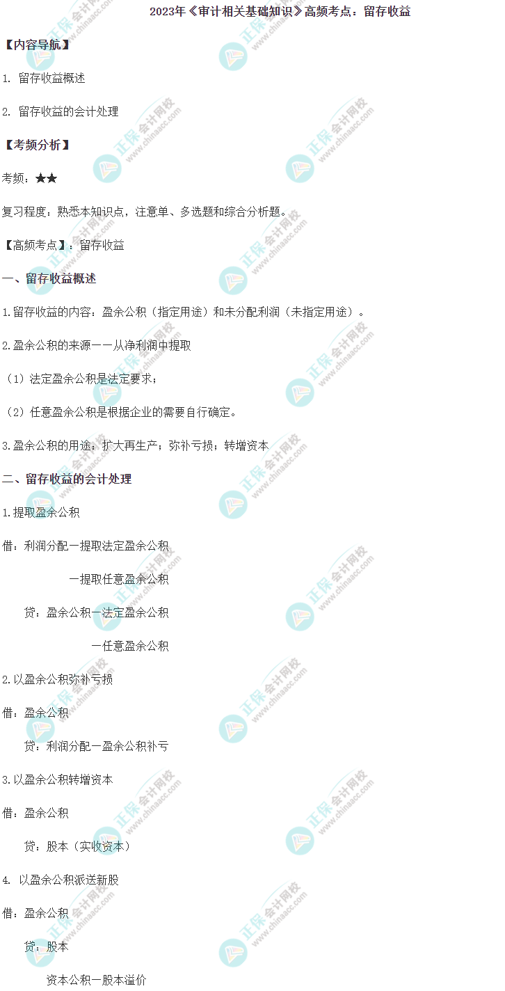 中级《审计相关基础知识》哪些知识点经常被考到呢?关注高频考点!下面是2023年中级《审计相关基础知识》高频考点:留存收益,你掌握了没?快复习一下吧。
