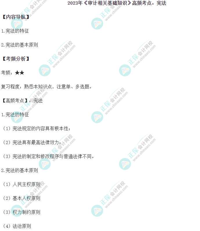 中级《审计相关基础知识》哪些知识点经常被考到呢?关注高频考点!下面是2023年中级《审计相关基础知识》高频考点:宪法,你掌握了没?快复习一下吧。