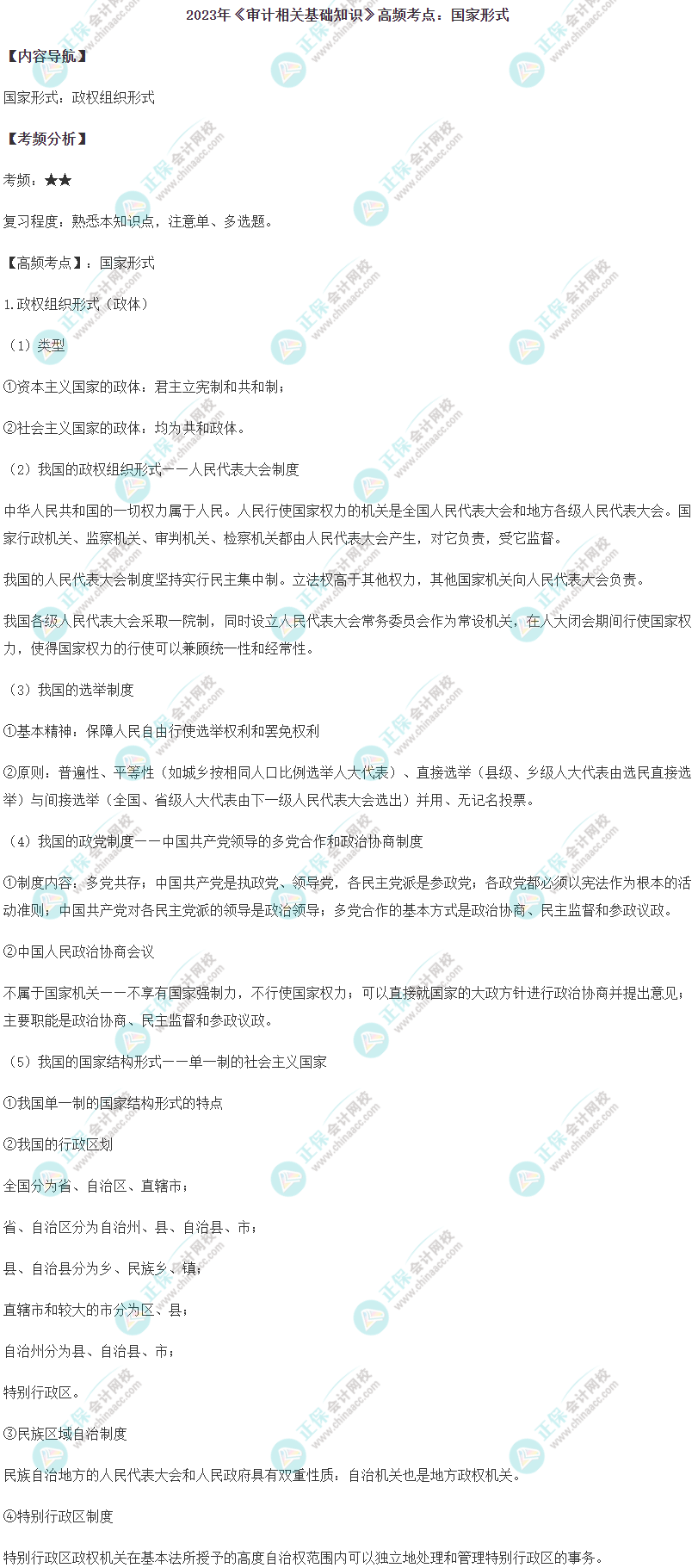 2023审计师备考内容多,学习一段时间注意总结,正保会计网校老师给大家整理了2023年审计师考试高频考点,下面是2023年中级《审计相关基础知识》高频考点:国家形式,赶紧看看,查漏补缺。