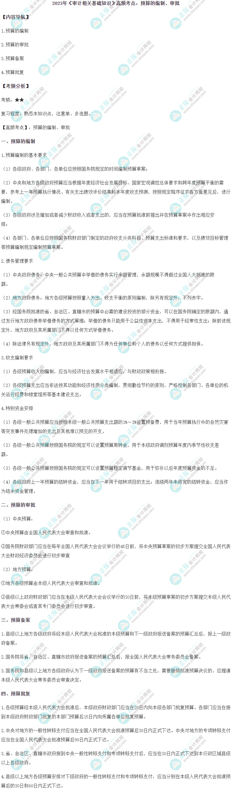 2023年审计师备考正在进行中,网校为各位考生整理了2023中级《审计相关基础知识》高频考点:预算的编制、审批,正在复习的同学快来查收!