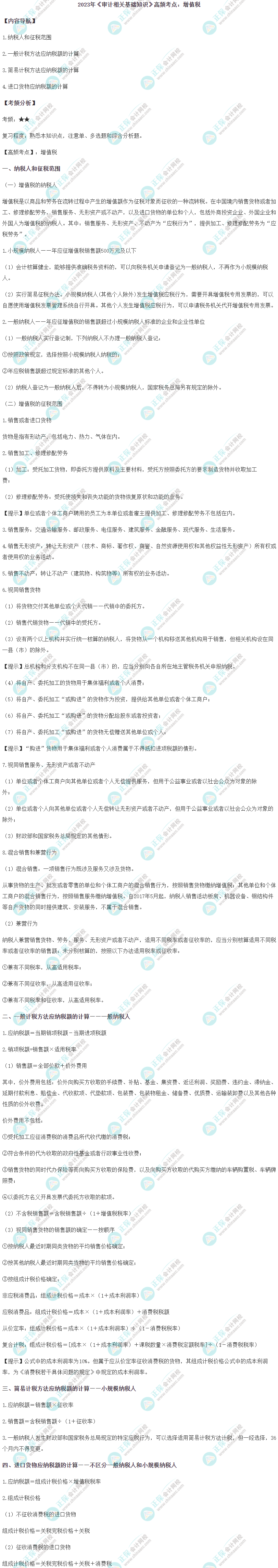 2023审计师备考内容多,学习一段时间注意总结,正保会计网校老师给大家整理了2023年审计师考试高频考点,下面是2023年中级《审计相关基础知识》高频考点:增值税,赶紧看看,查漏补缺。