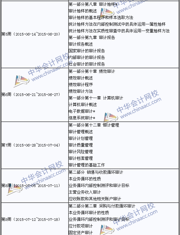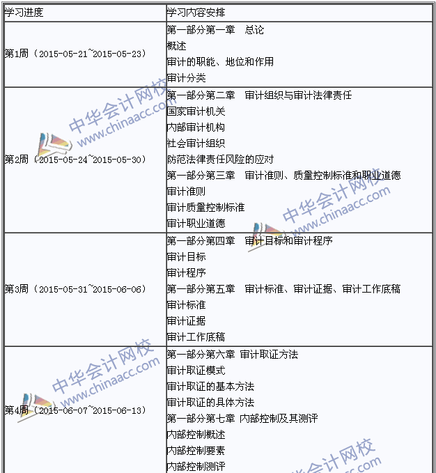 2、已报网校2015年中级审计师辅导精品班、实验班的同学,将由班主任老师根据您的学习基础及学习时间制定更详尽的计划表,如与本表不一致,请以班主任老师制定的学习计划为准。
