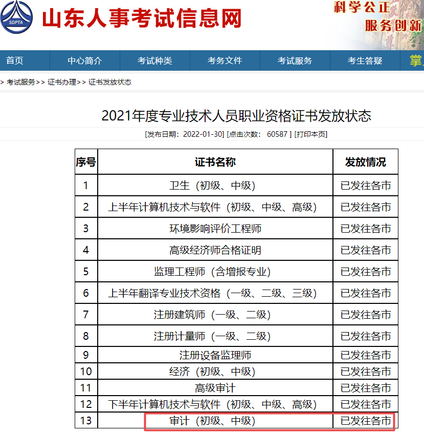 摘要:山东人事考试信息网发布“2021年度专业技术人员职业资格证书发放状态”可知,山东2021年初中级审计师证书已发往各市。