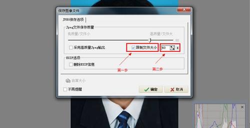 2、首先勾选“限制文件大小”(若无此选项请看下面补充操作),输入大小“60~90”数值,然后点击“确定”保存照片。