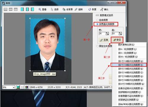 4、首先选择“按宽高比例裁剪”,点击“快设”,选择“按2寸/2R照片比例裁剪”,然后再照片上选取需要裁剪的区域,点击“确定”按钮保存设置。