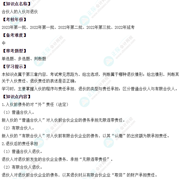中级会计经济法二十大恒重考点——合伙人的入伙与退伙