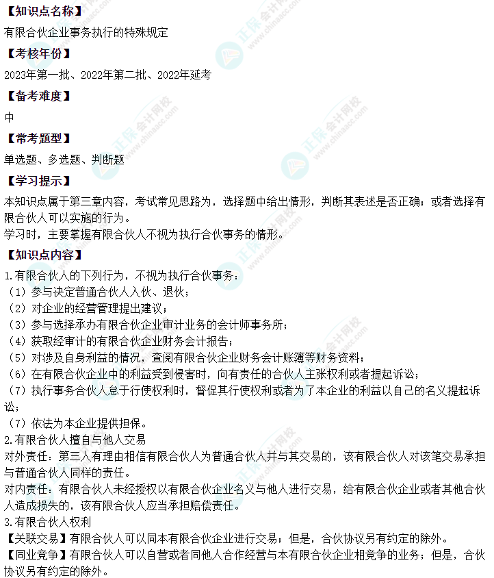 中级会计经济法二十大恒重考点——有限合伙企业事务执行的特殊规定