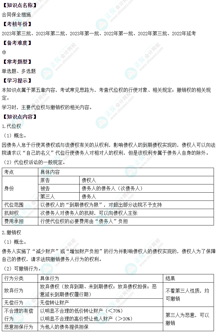 中级会计经济法二十大恒重考点——合同保全措施