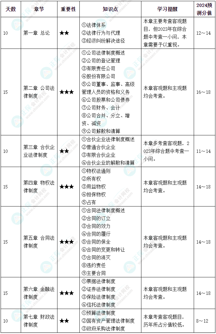 一、2024年中级会计职称《经济法》基础阶段学习计划安排