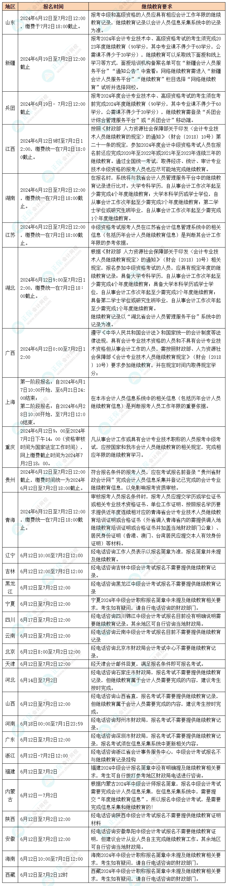 2024年中级会计考试报名时间为2024年6月12日—7月2日,从2024年中级会计考试各地报名简章中发现,多地要求报名前需完成会计人员继续教育。未完成继续教育可能会影响报名中级会计考试哦!网校为大家整理了2024年中级会计考试各地继续教育要求汇总,赶快来看看吧!