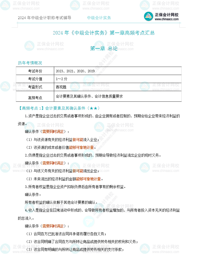 距离2024年中级会计考试越来越近,此时再去翻书挨个考点背诵记忆就太浪费时间了,正保会计网校为大家整理了2024年中级会计三科考前必看的高频考点,考前高效记忆就看它了!