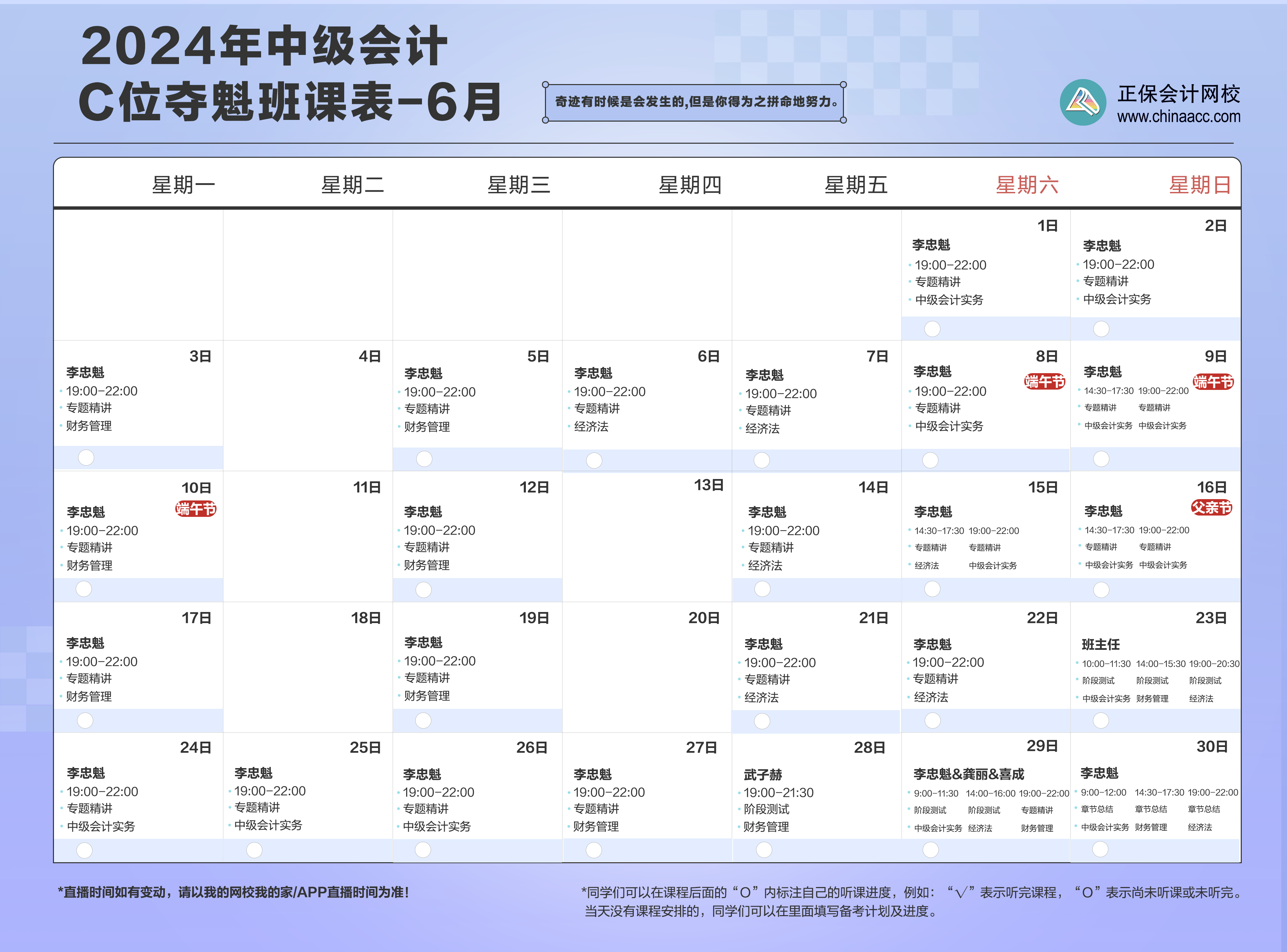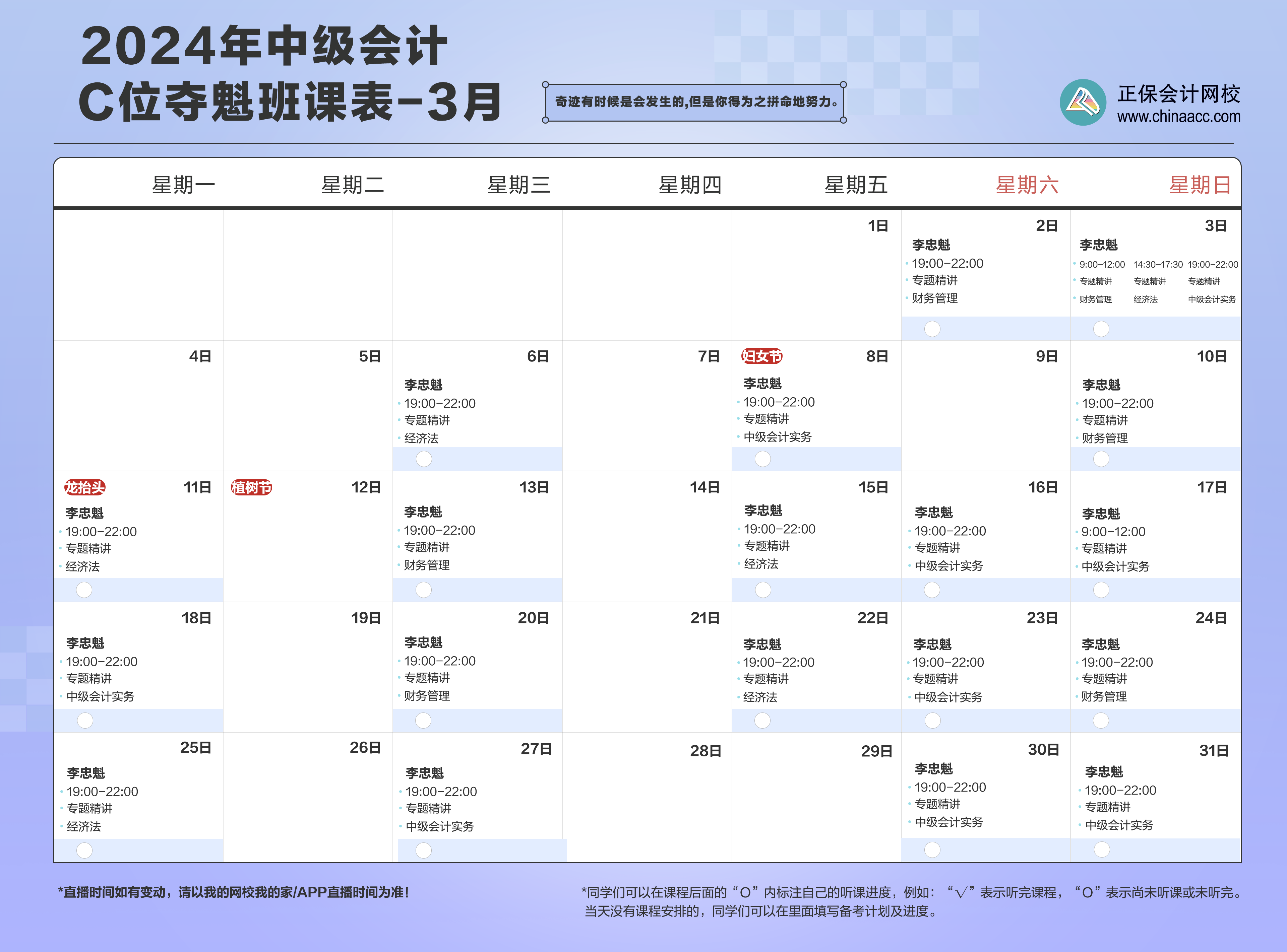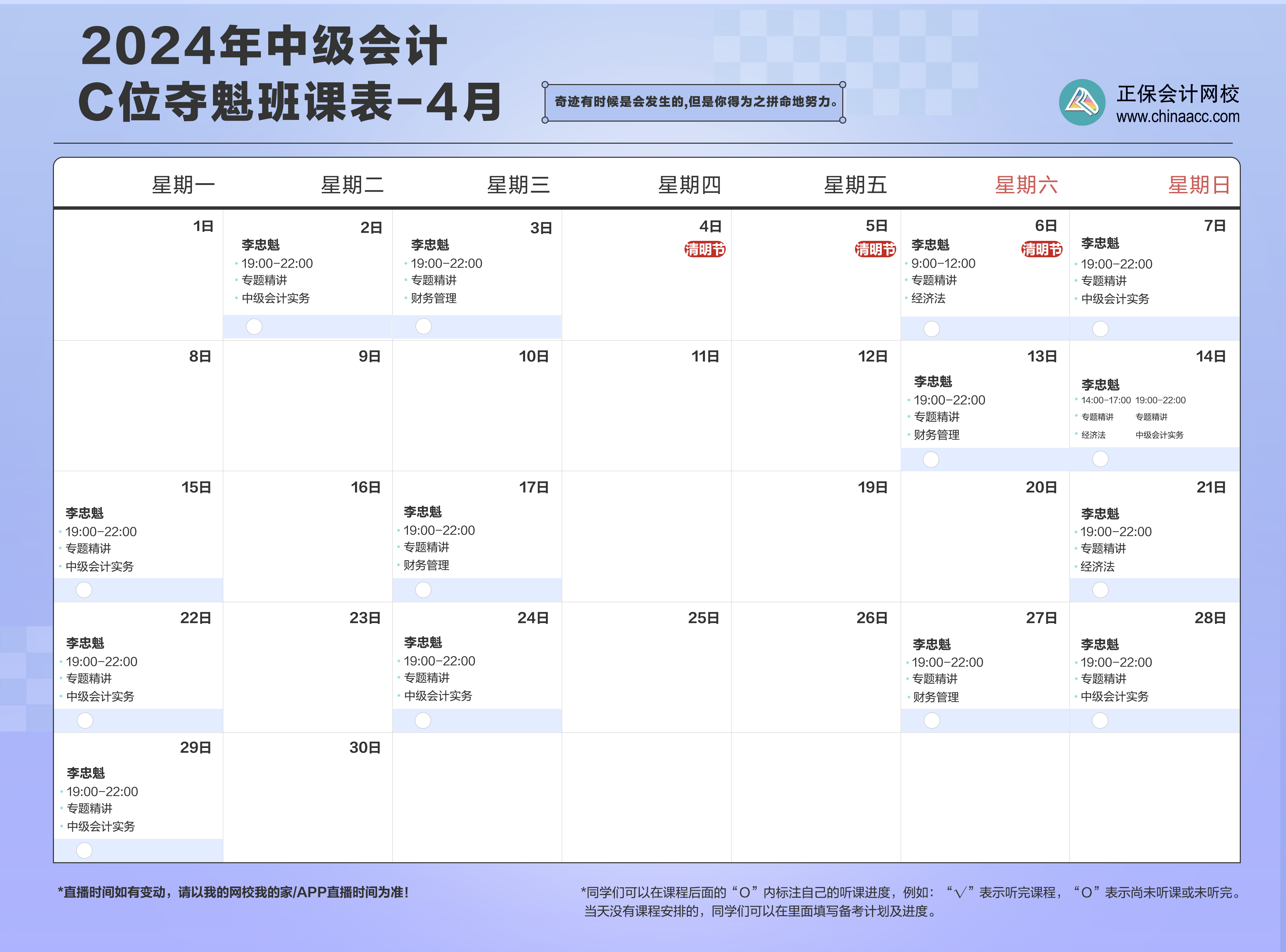 2024年中级会计职称备考正在进行中,李忠魁老师已经给C位夺魁班的同学们做好了学习计划啦!这份直播课表请查收,按时上课不要迟到哦!