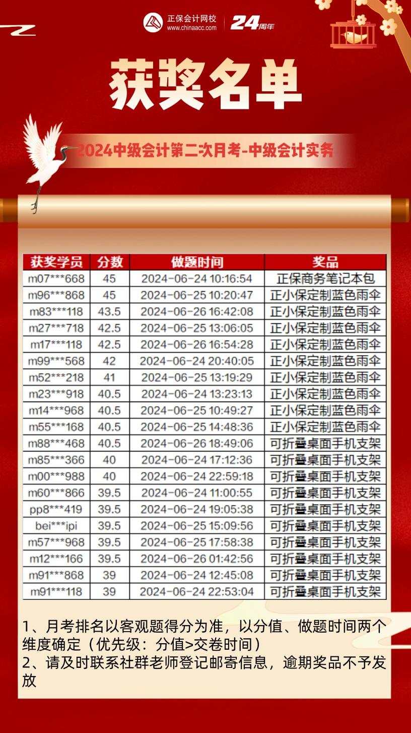 2024年中级会计职称第二次月考获奖名单公布啦,快来看看有没有你,获奖的同学们请及时联系社群老师登记奖品邮寄信息,逾期奖品不予发放哦!
